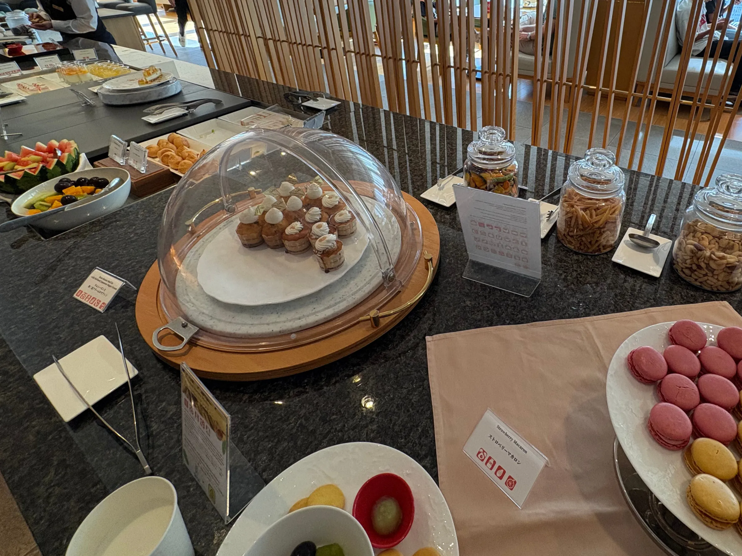 - チェックインはラウンジで。ティータイム中だったので、ケーキやマカロン、アイスをいただきながら手続き