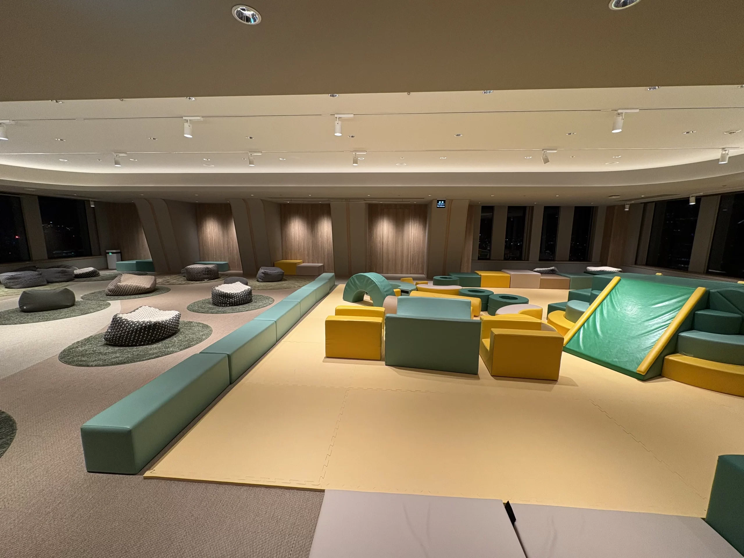 夜に訪れたときは人が少なく、落ち着いた雰囲気でした。子ども用のマットスペースと大人用エリアが分かれているので、子連れでも安心でした。